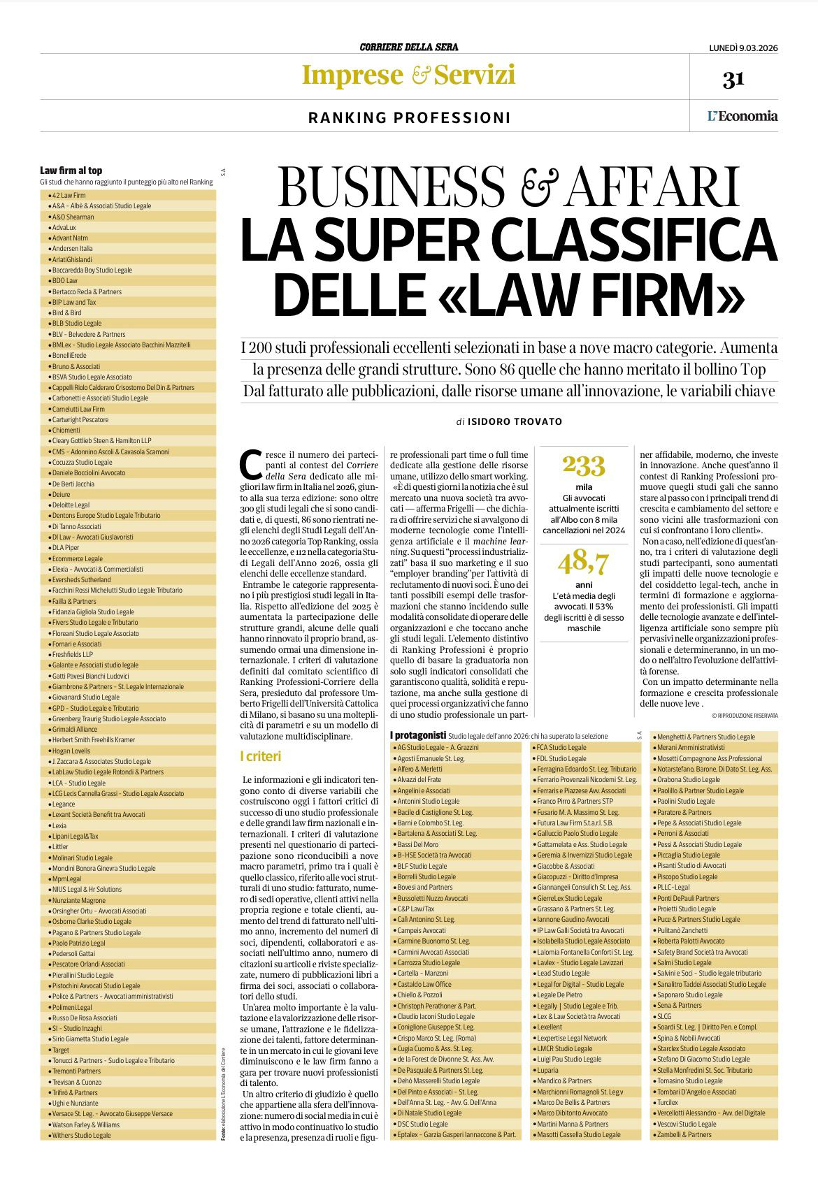 Lo Studio Legale Baccaredda Boy è entrato nel Top Ranking Studi Legali 2024 curato dal Corriere della Sera, iniziativa curata dal noto quotidiano nazionale con la volontà di testare gli studi legali più strutturati d’Italia e la loro capacità di innovare, di valorizzare donne e giovani, di svolgere attività collaterali.
